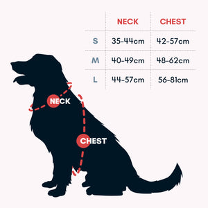 🐶 Four way adjustable webbing around your dogs neck and chest ensuring the perfect fit. Please see our measurement guide for more details and ensure you measure around your dog with two fingers inserted around the neck and chest for maximum comfort.