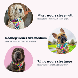 🐶 Four way adjustable webbing around your dogs neck and chest ensuring the perfect fit. Please see our measurement guide for more details and ensure you measure around your dog with two fingers inserted around the neck and chest for maximum comfort.